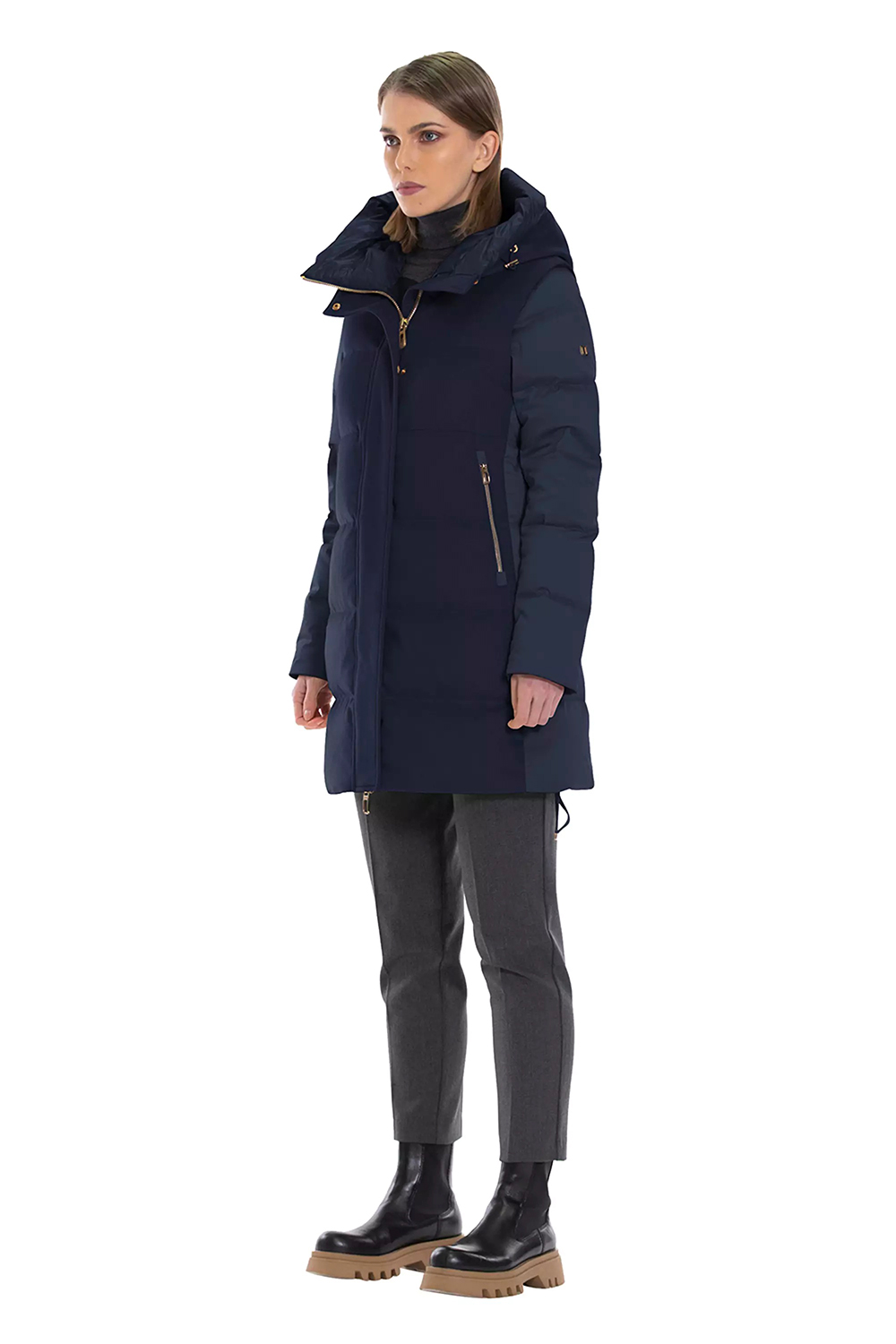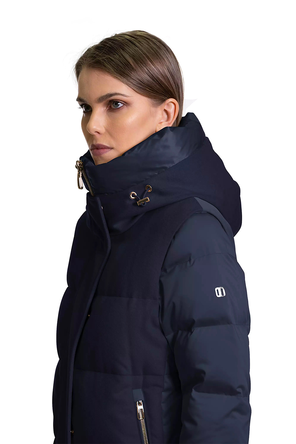 • Trapuntato in raso tecnico con interventi in lana per la parte frontale ed il collo