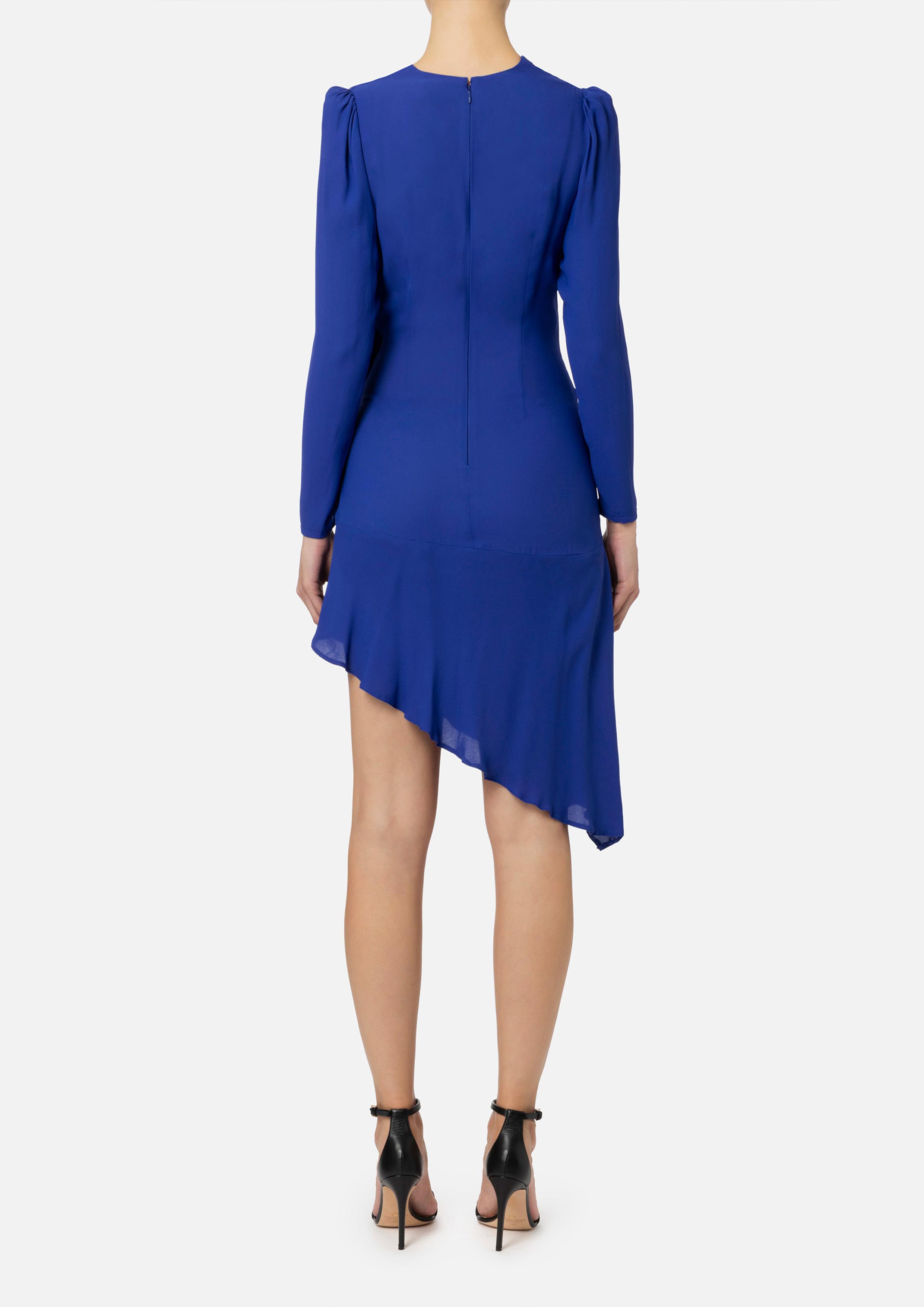 • Punto vita con drappeggio trattato da nodo che parte dal fianco e termina con balza al fondo