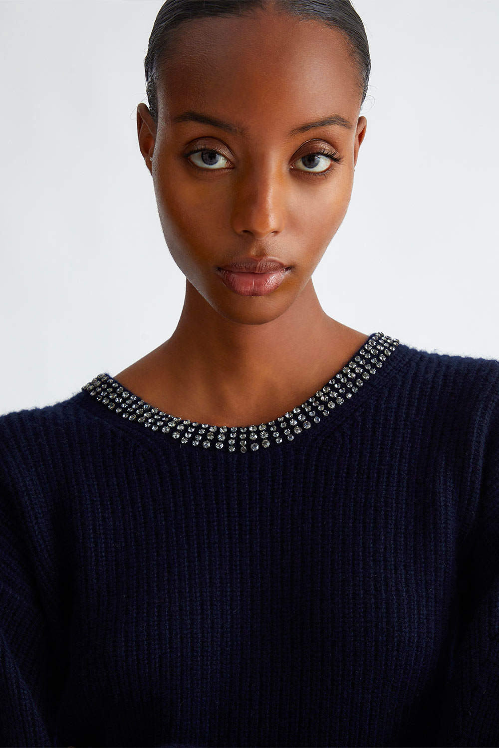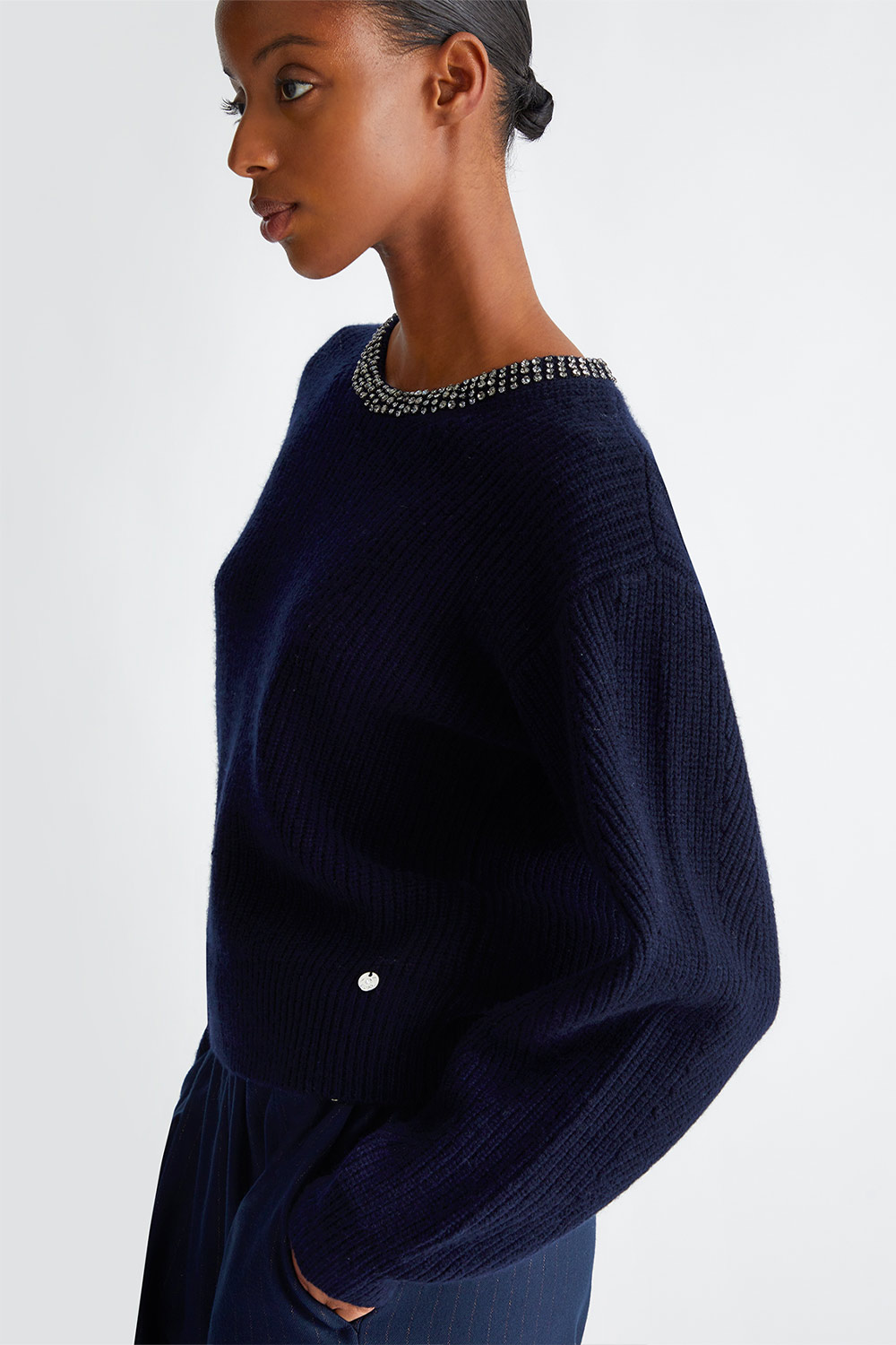 • Taglio girocollo con strass applicati
