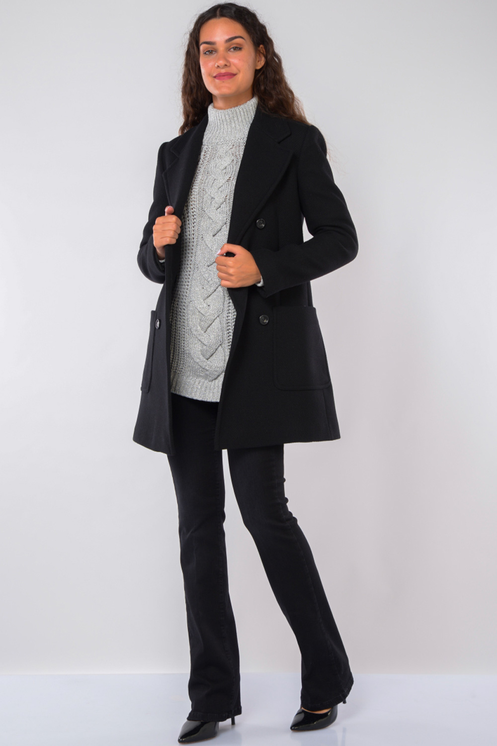 • Chiusura frontale a doppiopetto con bottoni logati a vista in tono colore
