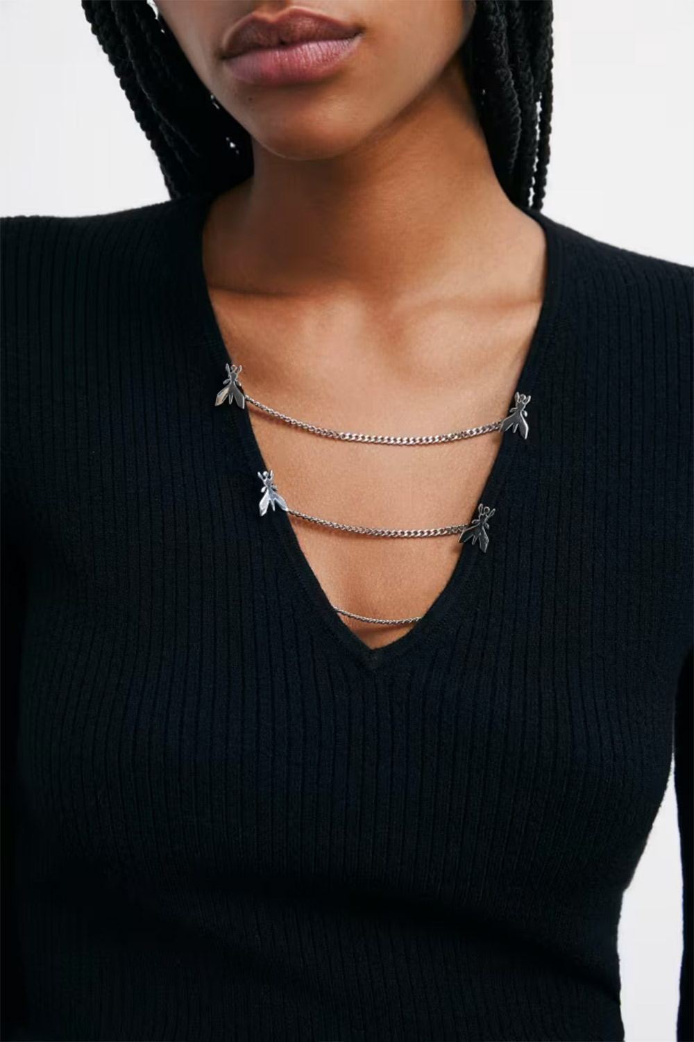• Dettaglio di catene con logo Fly sullo scollo davanti